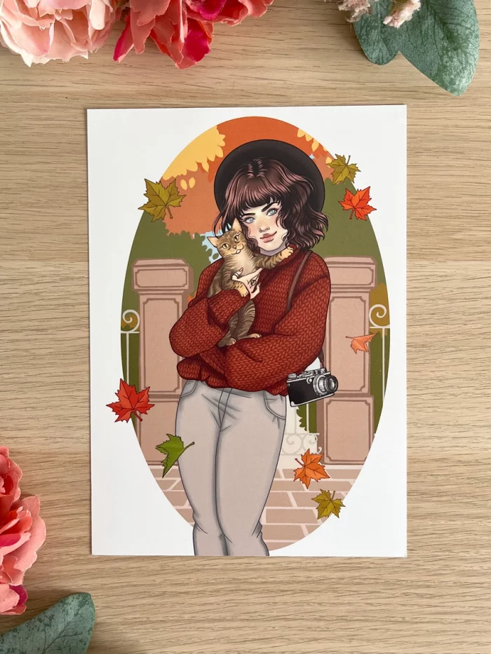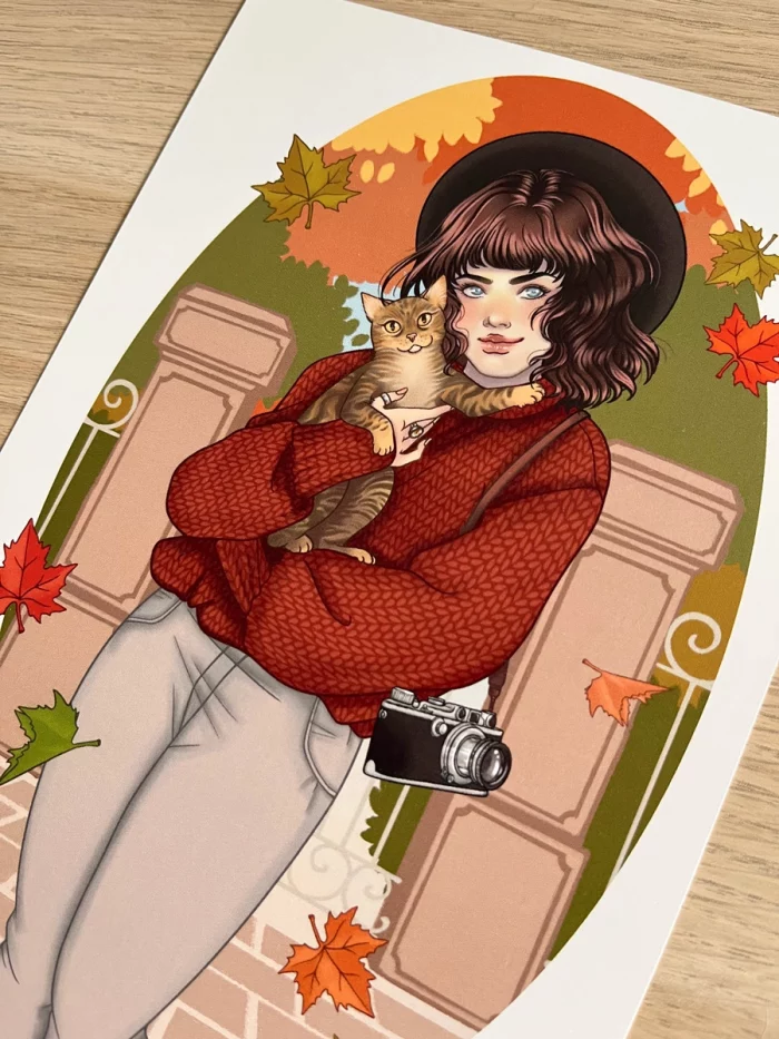 Ilustración original a todo color que refleja la calidez del otoño, con tonos de rojo, naranja y amarillo que envuelven la escena. La protagonista de ojos azules, abraza a un gatito de pelaje marmolado, inspirado en mi querida Phoebe.