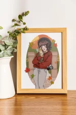 La chica lleva una cámara colgando de un hombro, un pequeño guiño a uno de mis oficios: la fotografía. El ambiente otoñal envuelve la composición, capturando el encanto de los días en los que el otoño muestra su máxima expresión.