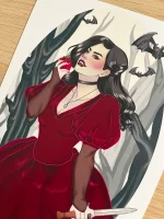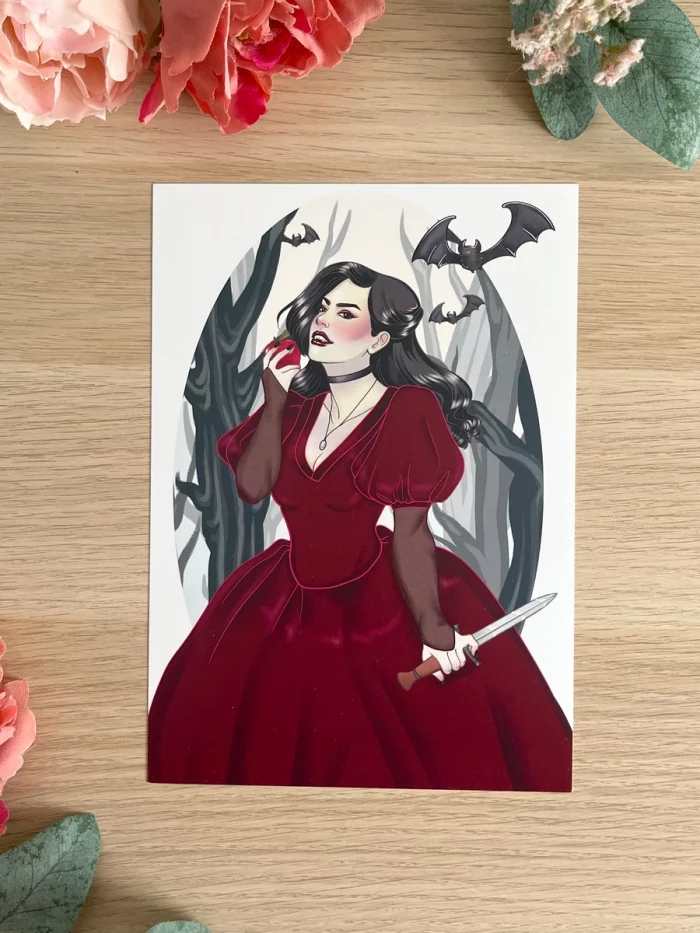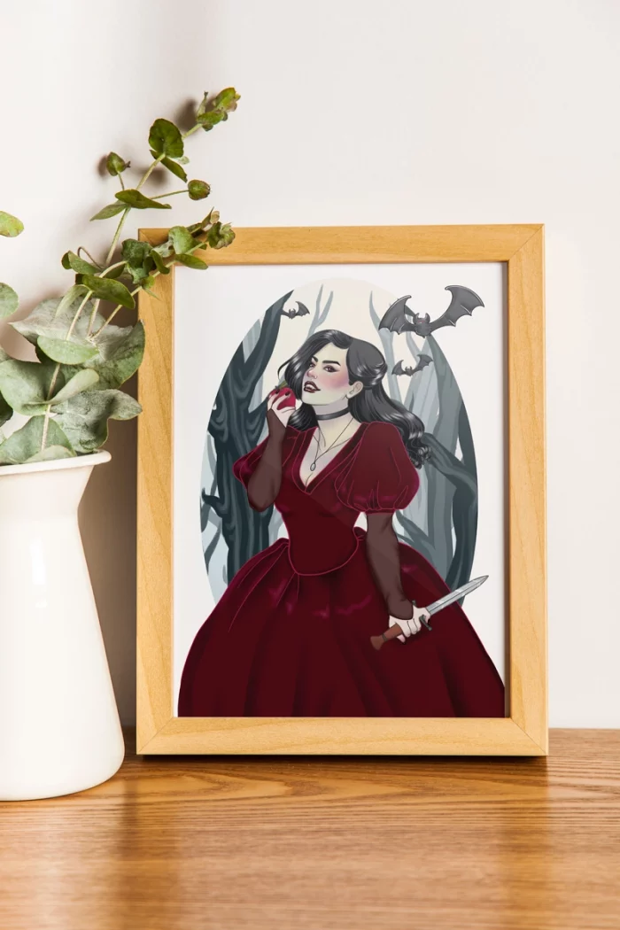 Ilustración original a todo color que captura la belleza oscura y gótica de una vampiresa, en un homenaje a Tanith Lee y su relato «Roja como la sangre», donde la autora reimagina el mito de Blancanieves de una manera inquietante y fascinante.