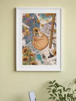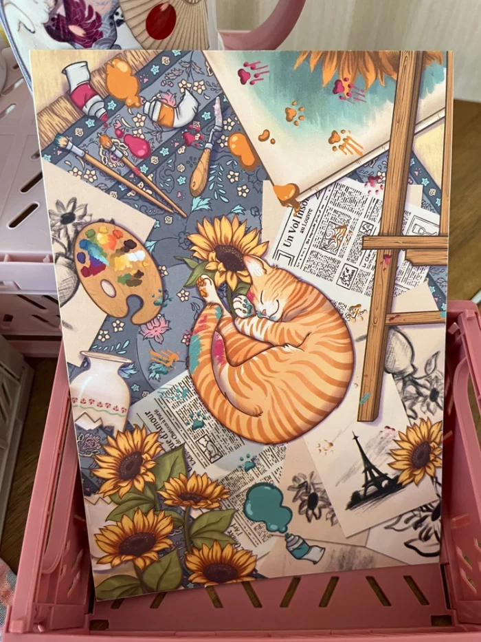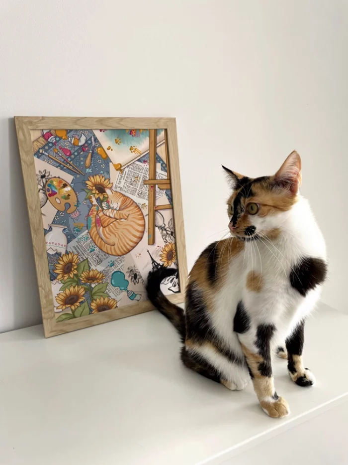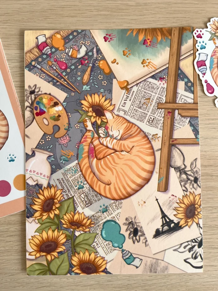Ilustración original a todo color de Toulouse, el gatito francés que se ha quedado dormido tras desatar su propio caos artístico en el estudio. Rodeado de pinceles, un lienzo, girasoles caídos y bocetos esparcidos, Toulouse descansa plácidamente mientras el desorden cuenta su propia historia.