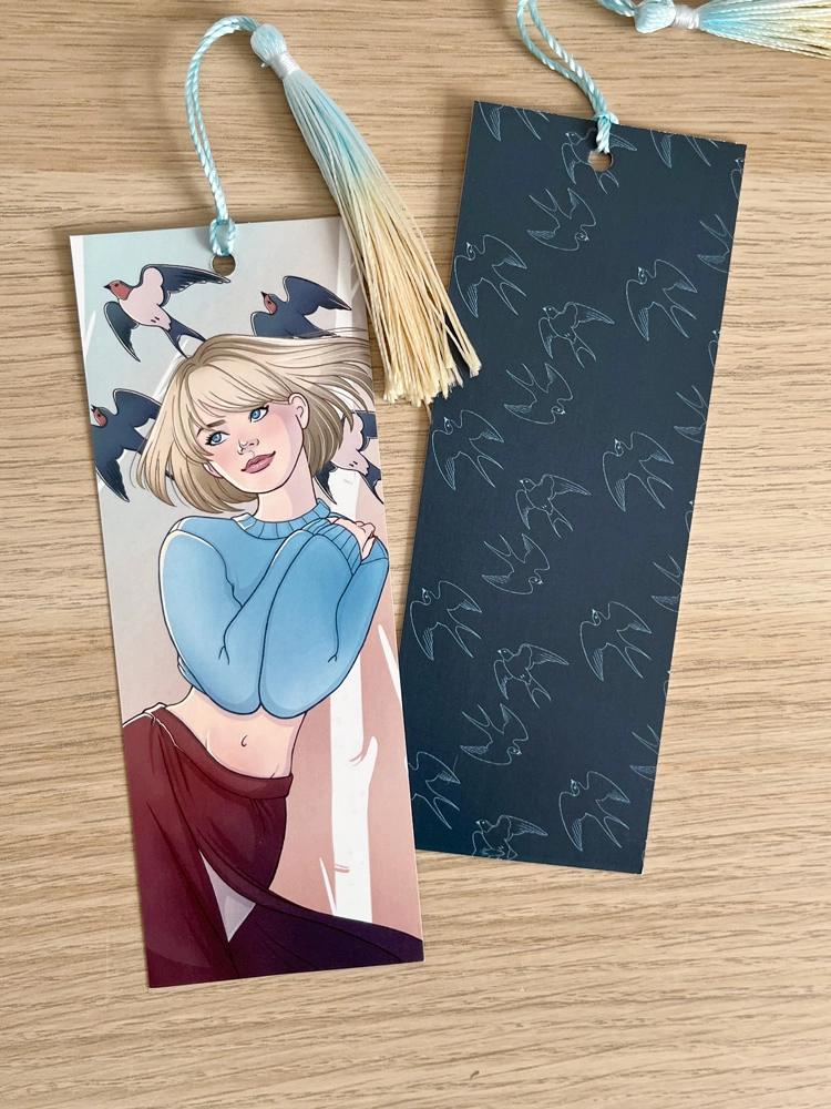 Ilustración original a todo color que captura la esencia de la esperanza y la renovación. La protagonista es una joven rubia en un encantador escenario invernal, acompañada de elegantes golondrinas que simbolizan la esperanza y los nuevos comienzos.