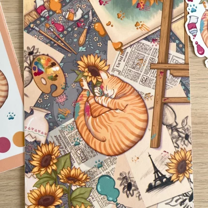 Toulouse, el gatito francés, se ha quedado dormido tras desatar su propio caos artístico en el estudio. Entre pinceles, lienzos, girasoles caídos y bocetos esparcidos, descansa plácidamente mientras el desorden cuenta su propia historia.